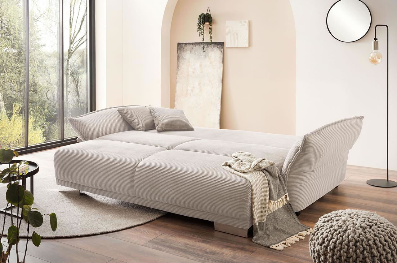 das Möbel mit einer Schlaffunktion ausgestattet. Sie können also Ihrem Besuch eine komfortable Übernachtungsmöglichkeit mit einer Liegefläche von ca. 168 x 199 cm anbieten und Ihr Gast kann erholt in den neuen Tag starten. Dank des verbauten Bettkastens können Sie Kissen und Decken blickdicht lagern und Bedarf hervorholen. Dieses unschlagbare Angebot wird durch die 4 Rücken- und 2 Zierkissen